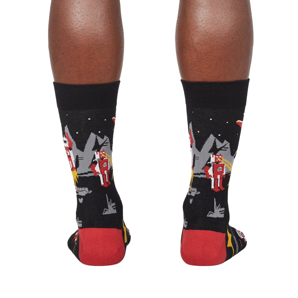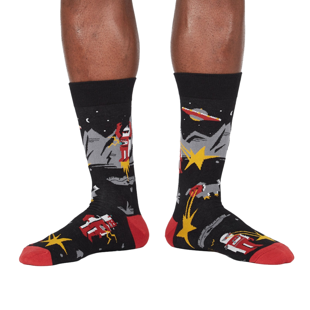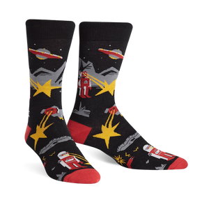 Caution, these socks may be too thrilling for the faint of heart! Get ready for an intergalactic showdown with our Zap! Zap! socks. Take a peek and you'll see stars, saucers, and robots shooting laser beams. Featuring a electrifying pattern of red and yellow stars, grey and red robots, yellow and red lasers, and flying saucers against a black backdrop, these crew-length socks are sure to make feet the center of any Sci-Fi fan's universe.