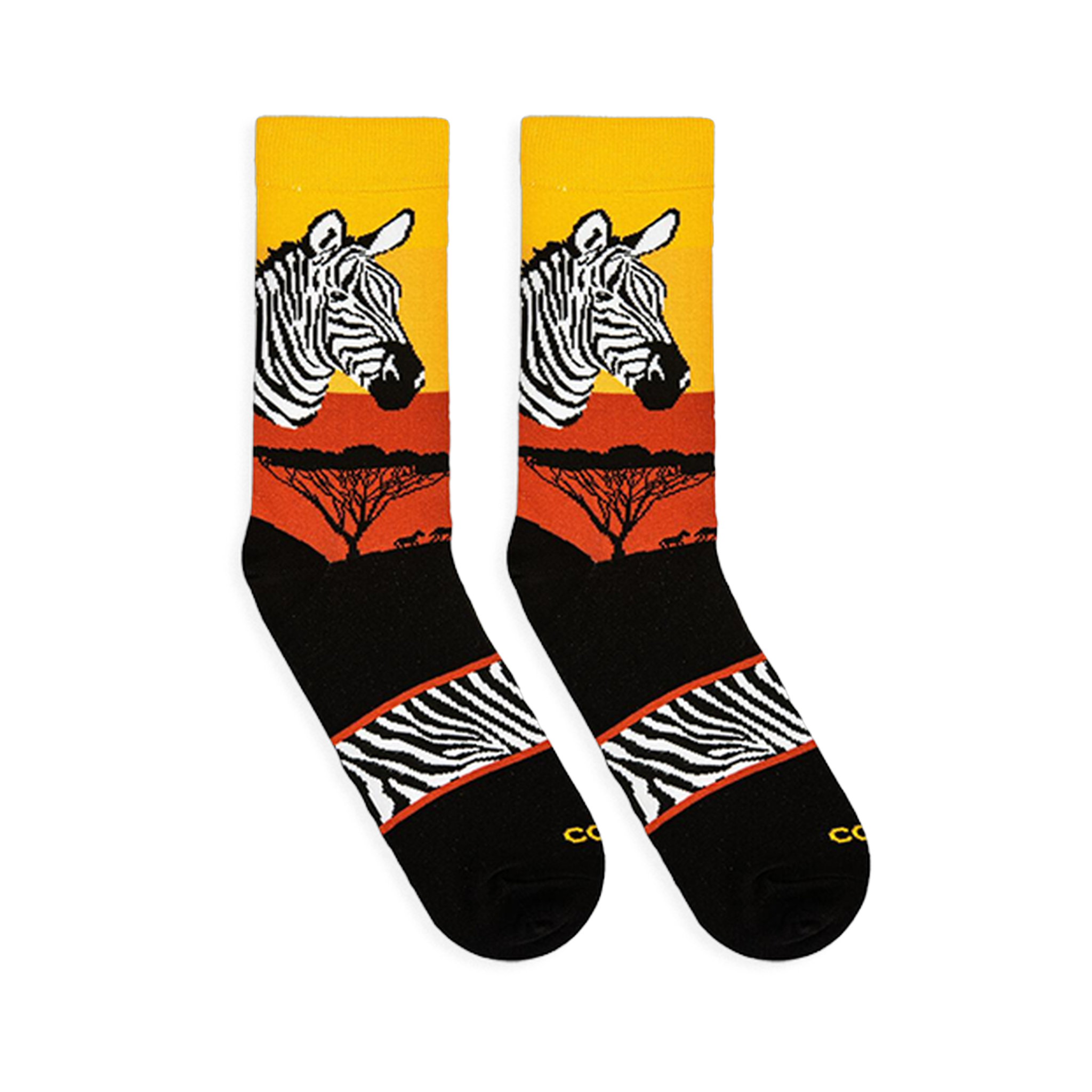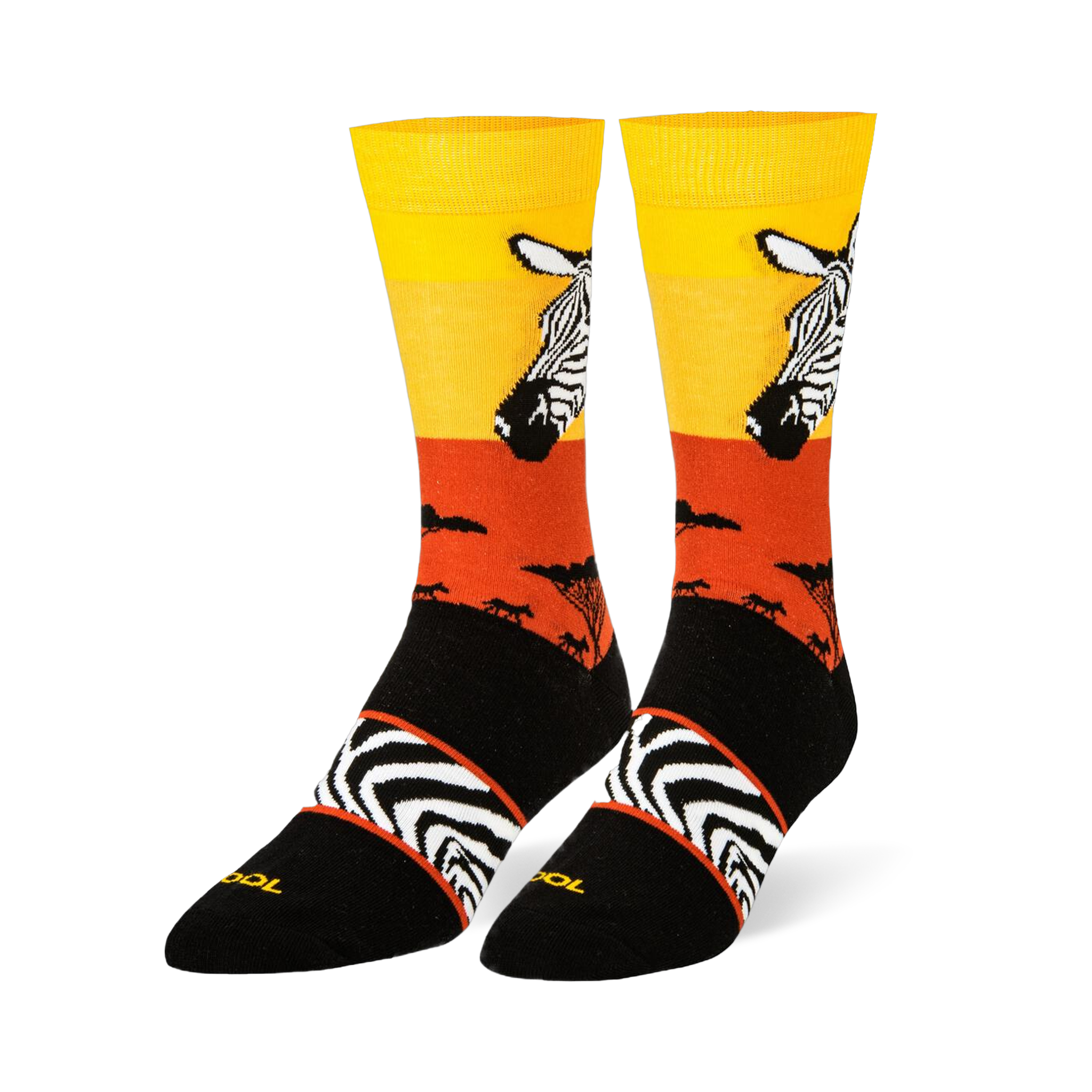 The Zebra Safari crew socks bring a bold, graphic look to an everyday essential. A zebra peeks through the design, framed by warm sunset tones and sharp black-and-white stripes that give the pair a strong visual rhythm. For men's crew socks, they strike a nice balance between playful and polished, with enough personality to stand out without feeling overdone.