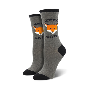 Got nothing to wear and need a quick pick-me-up? Throw on these Zero Fox Given socks and start your day with a laugh. These socks feature an adorable orange fox face with the words 'ZERO FOX GIVEN' underneath. Made for women with a crew length, these gray socks with black toes, heels, and cuffs will make even the most mundane tasks a little more fun.